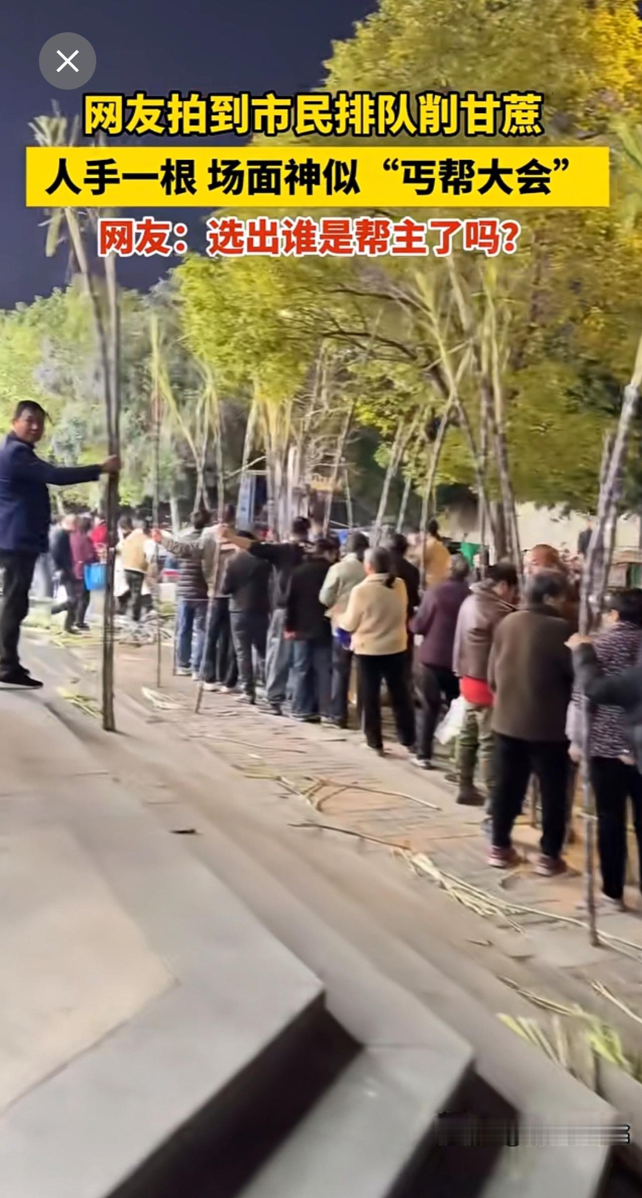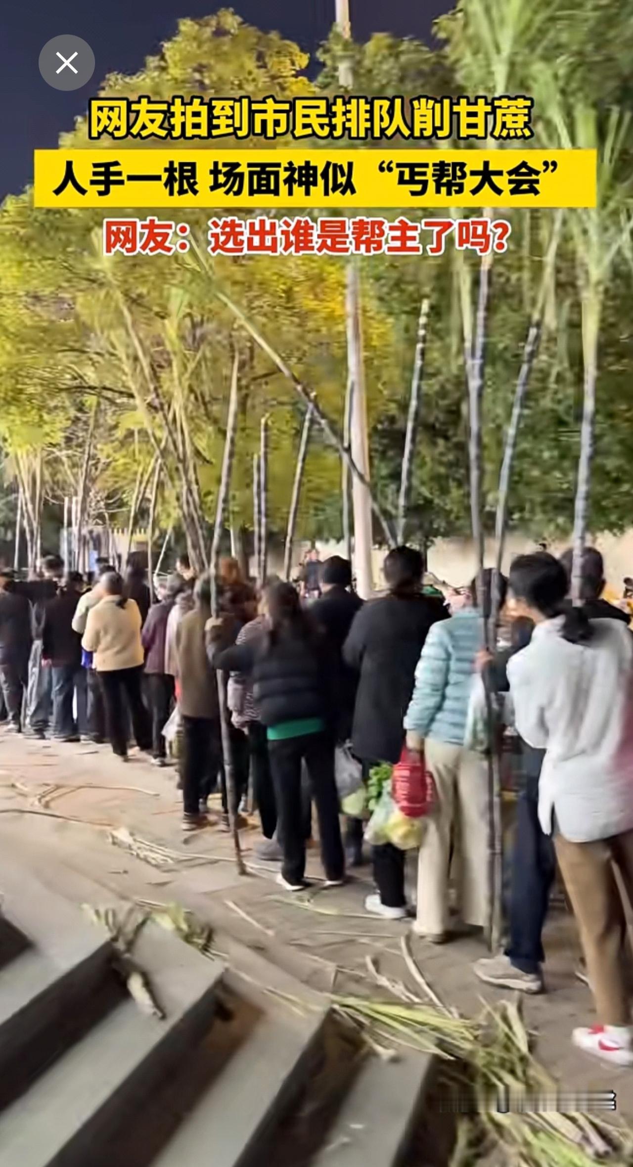 网友拍到市民排队削甘蔗,人手一根,场面神似“丐帮大会”。网友:选出谁是帮主了吗? 氛围感 丐帮 丐帮氛围 削甘蔗