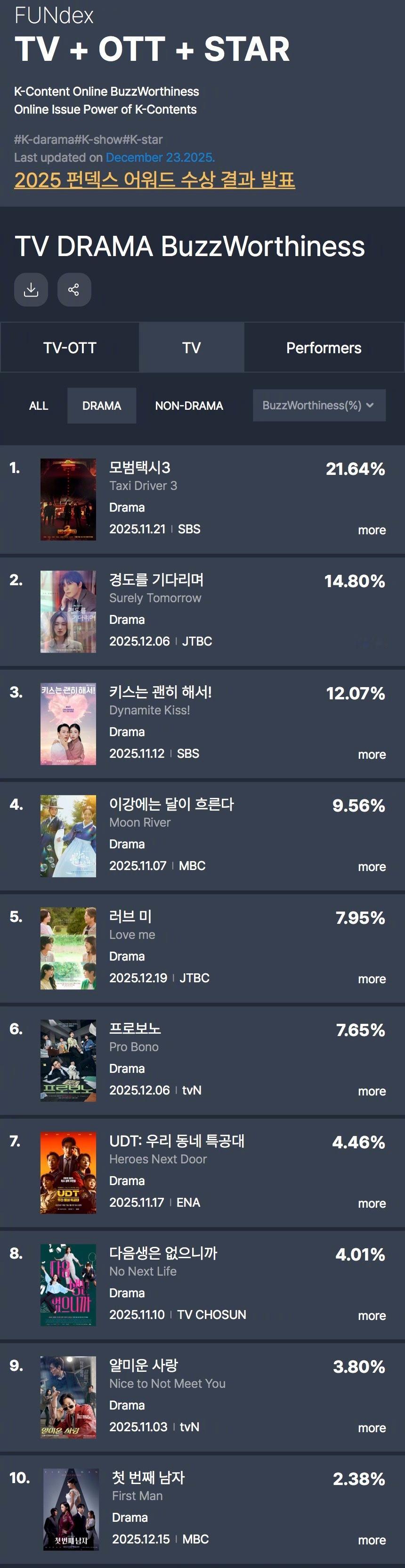 GOODDATA公布2025年12月第3周TV-OTT热度话题性排行。1.模范出租车3 18.35% 2.等待京道 12.55%3.一吻爆炸 10.23%4.月亮在江边流淌 5.韩剧Love Me 6.韩剧公益律师 7.认罪之罪 8.韩国制造 9.UDT:我们小区特工队 10.因为没有下辈子 GOODDATA公布2025年12月第3周电视剧热度话题性排行。1.模范出租车3 21.64%2.等待京道14.80%3.一吻爆炸 12.07%4.月亮在江边流淌韩剧公益律师 5.韩剧Love Me 6.韩剧公益律师 7.UDT:我们小区特工队 8.因为没有下辈子 9.不幸的幸会 10.第一个男人
