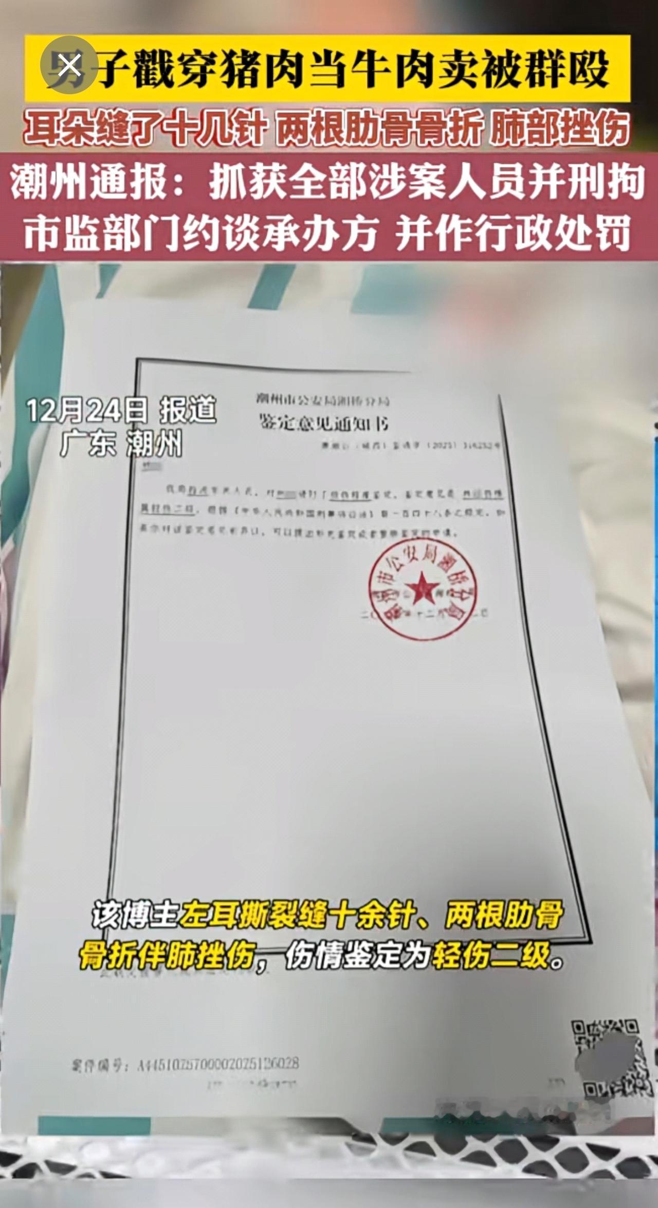 男子戳穿猪肉当牛肉卖被群殴 耳朵缝了十几针 两根肋骨骨折 肺部挫伤 潮州通报:抓