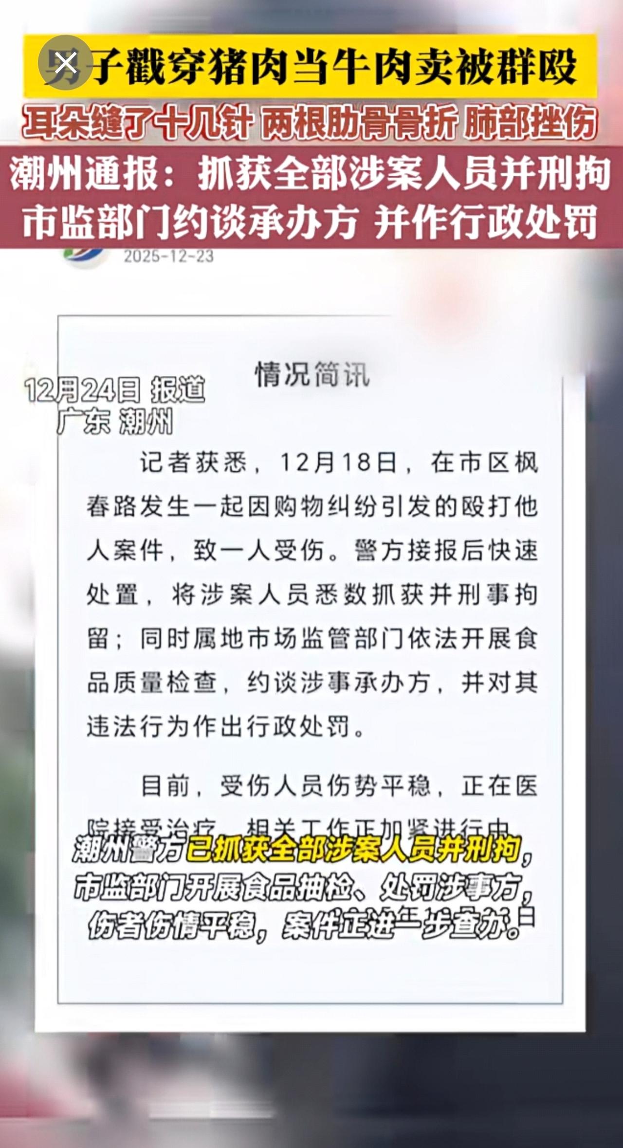 男子戳穿猪肉当牛肉卖被群殴 耳朵缝了十几针 两根肋骨骨折 肺部挫伤 潮州通报:抓获全部涉案人员并刑拘 市监部门约谈承办方 并作行政处罚。
