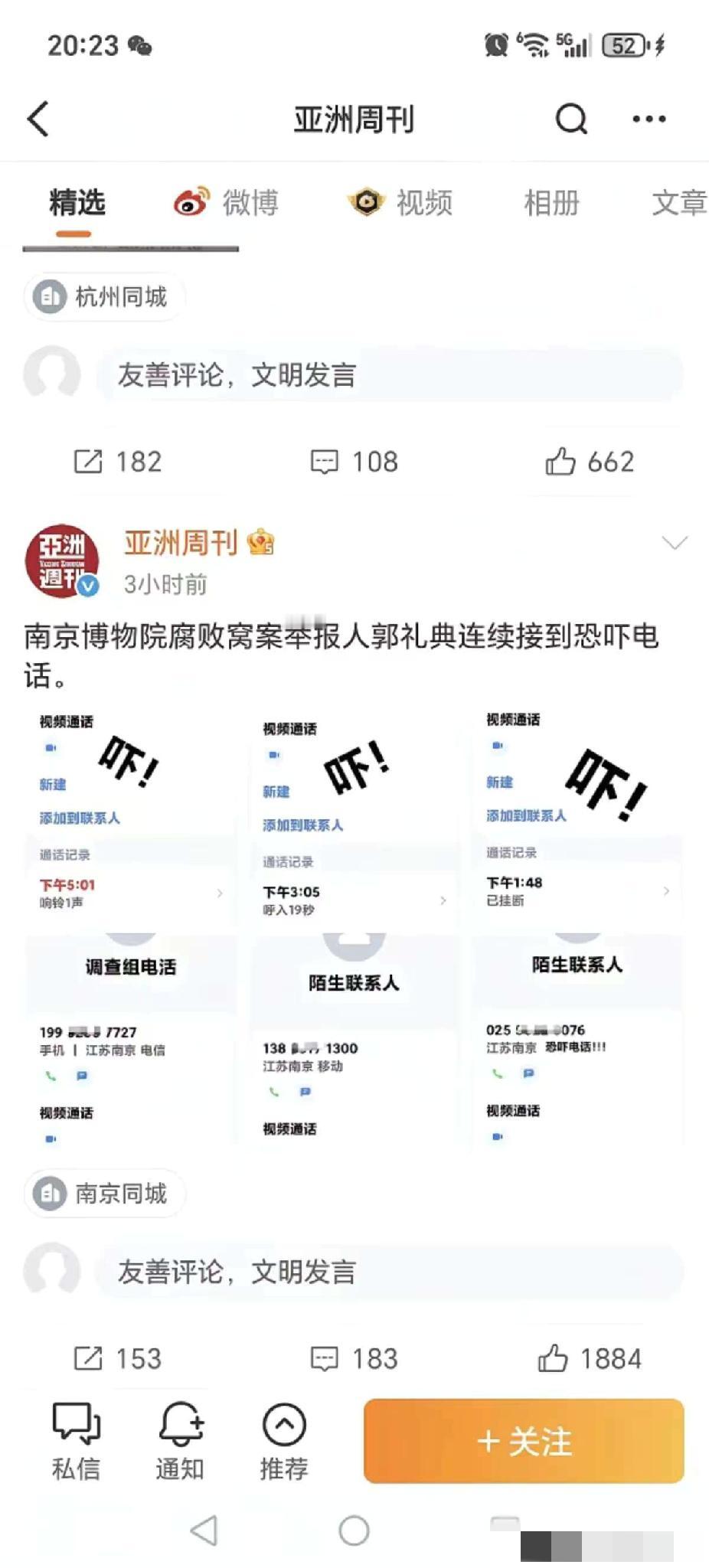 不要乱说话, 举报人郭礼典遭遇警告, 亚洲周刊爆料上午刚在西康宾馆接受工作组问询,下午就接到了六七个恐吓电话! 最关键的是这些打过来的号码都是一些虚拟号,见郭礼典一开始没有接还连续换了好几个继续打过来,最终郭老爷子实在受不了就接起一个,二人通话时间只有19秒,对方警告他不要乱说话。 而且这会也有网友到徐湖平家中探访,发现只有保姆在家过来开门,邻居们说徐湖平夫妻二人喝茶去了。 看来这会有人是真着急了,这次恐吓郭礼典的人使用的是虚拟号,咱们普通人查不出来,难道帽子叔叔还揪不出来吗?只要顺着这些号码查到底,就可以知道到底是哪些人敢这么大胆打过来。 不得不说,亚洲周刊不愧是国际新闻,这波真够硬的。