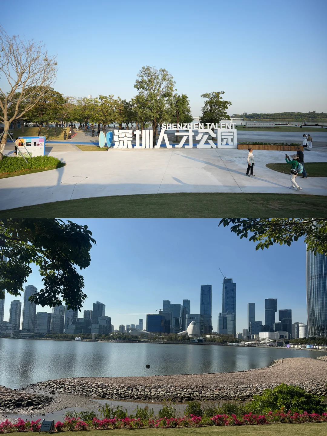 📸上午先去人才公园吸氧!芦苇荡随风摇晃,湖水倒映着后海建筑群,随手拍都是都市森林大片。步行5分钟到深圳湾公园租辆单车,沿着海岸线骑行,海风拂面超舒服,远眺深圳湾大桥和香港群山,治愈感直接拉满。