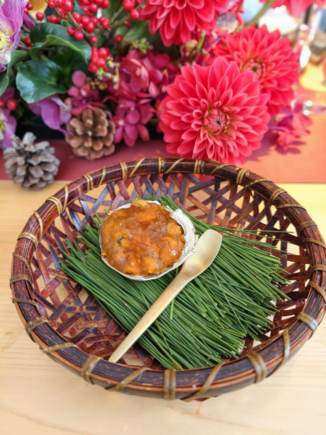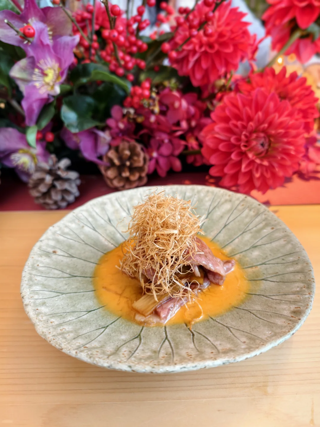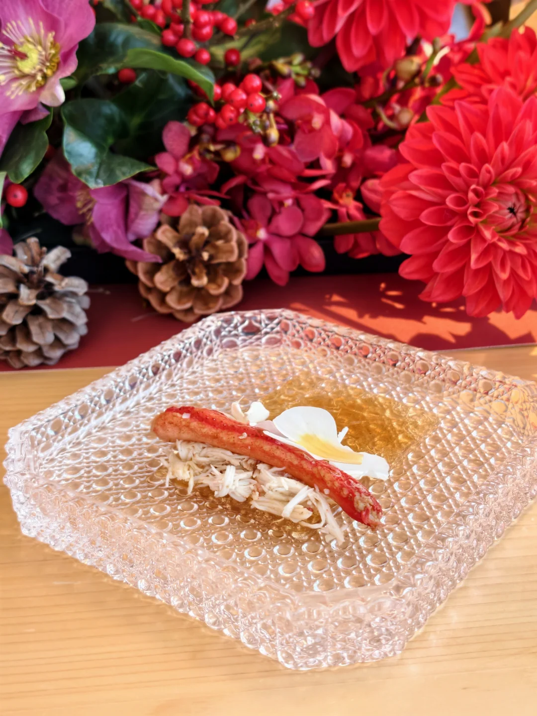 🍶终巡「时境」直接封神!银杏叶炸梭子蟹盒外酥里嫩,熟醉长脚蟹浸满黄酒香气,和牛寿喜烧的丰腴油脂,被慢宋2020单一年份酒的复杂风味完美承接——经过时光沉淀的酒体,酸甜平衡且回甘十足,解腻又提鲜。收尾的圣诞冰淇淋清润爽口,为这场晚宴画上圆满句号。