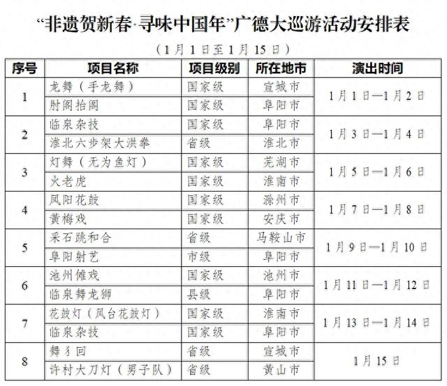 大皖新闻讯记者从广德市文化馆了解到,2026年1月1日-15日,安徽主场非遗巡演第一阶段落地广德,活动地点在广德市迎春街-绥安路。