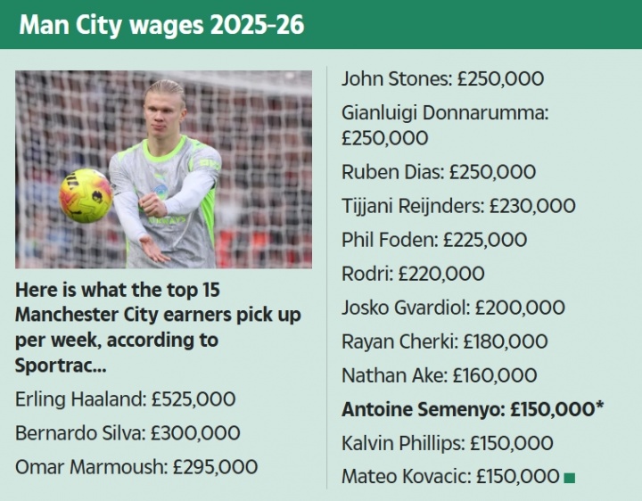 《太阳报》援引《卫报》、Sportrac的数据指出,塞梅尼奥在曼城的薪资将达到15万镑,虽然大幅上涨,但只能排在曼城队内并列第13位。