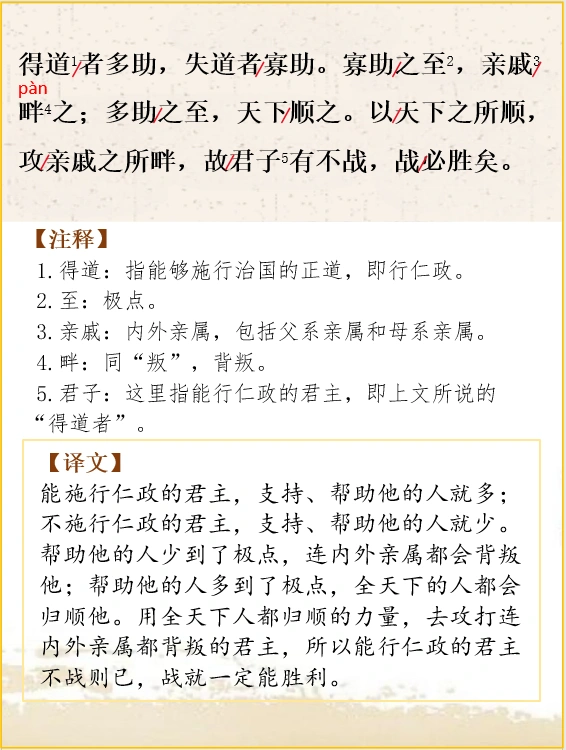所以说:使百姓定居下来(而不迁到别的地方去),不能靠疆域的边界,巩固国防不能靠山河的险要,威慑天下不能靠武器的锐利。能施行仁政的君主,支持、帮助他的人就多;不施行仁政的君主,支持、帮助他的人就少。帮助他的人少到了极点,连内外亲属都会背叛他;帮助他的人多到了极点,全天下的人都会归顺他。用全天下人都归顺的力量,去攻打连内外亲属都背叛的君主,所以能行仁政的君主不战则已,战就一定能胜利。