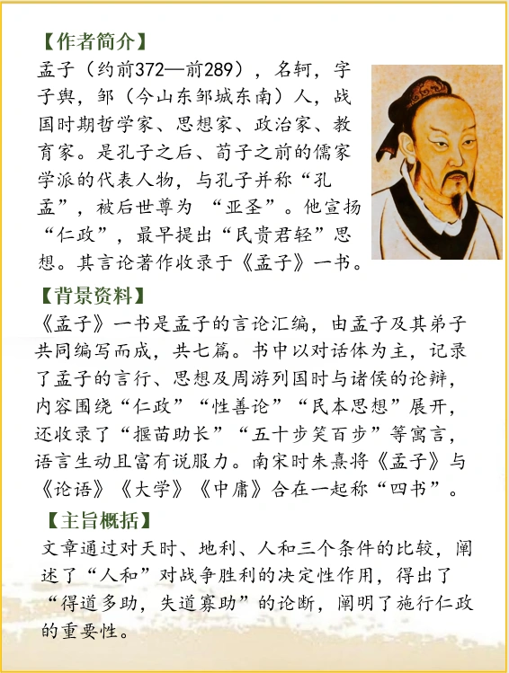 文章通过对天时、地利、人和三个条件的比较,阐述了“人和”对战争胜利的决定性作用,得出了“得道多助,失道寡助”的论断,阐明了施行仁政的重要性。