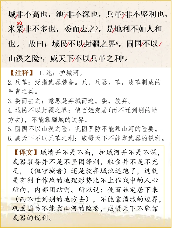 (比如一座)方圆三里的内城,只有方圆七里的外城,四面包围起来攻打它,却不能取胜。采用四面包围的方式攻城,必定是得到了有利于作战的天气、时令,可是不能取胜,这是因为有利于作战的天气、时令比不上有利于作战的地理形势啊。城墙并不是不高,护城河并不是不深,武器装备并不是不坚固锋利,粮食并不是不充足,(但守城者)还是放弃城池逃跑了,这就是有利于作战的地理形势比不上作战中的人心所向、内部团结啊。