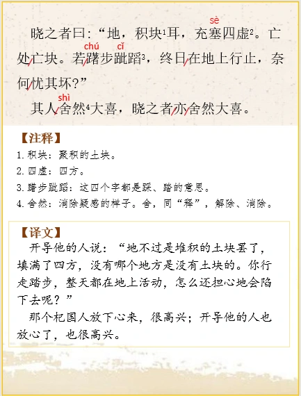 开导他的人说:“地不过是堆积的土块罢了,填满了四方,没有哪个地方是没有土块的。你行走踏步,整天都在地上活动,怎么还担心地会陷下去呢?”