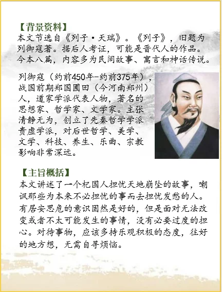 本文节选自《列子·天瑞》。《列子》,旧题为列御寇著。据后人考证,可能是晋代人的作品。今本八篇,内容多为民间故事、寓言和神话传说。