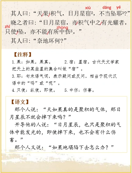 开导他的人说:“日月星辰,也只是聚积的气体中能发光的,即使掉下来,也不会有什么伤害。”