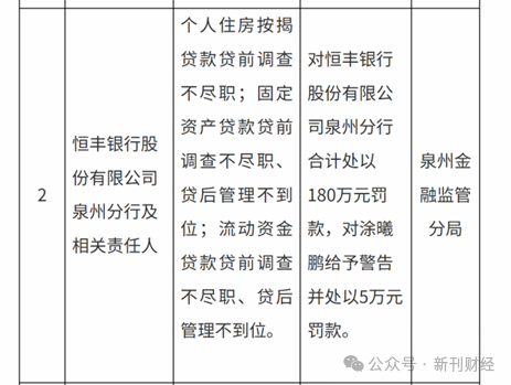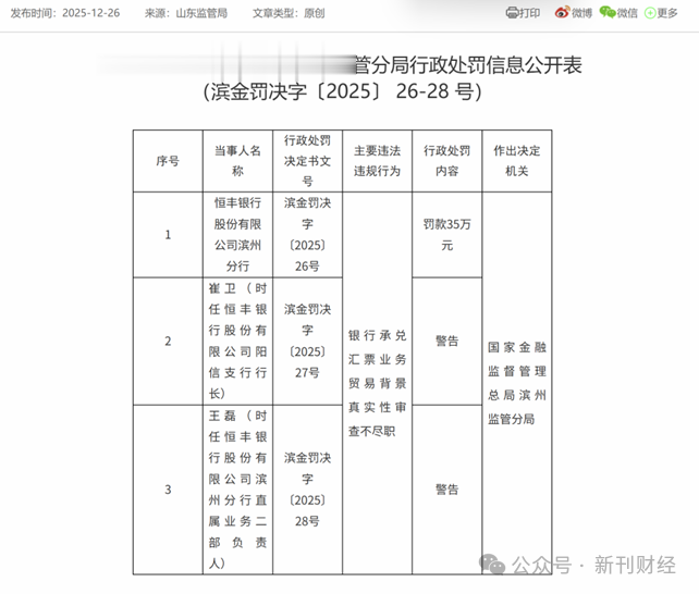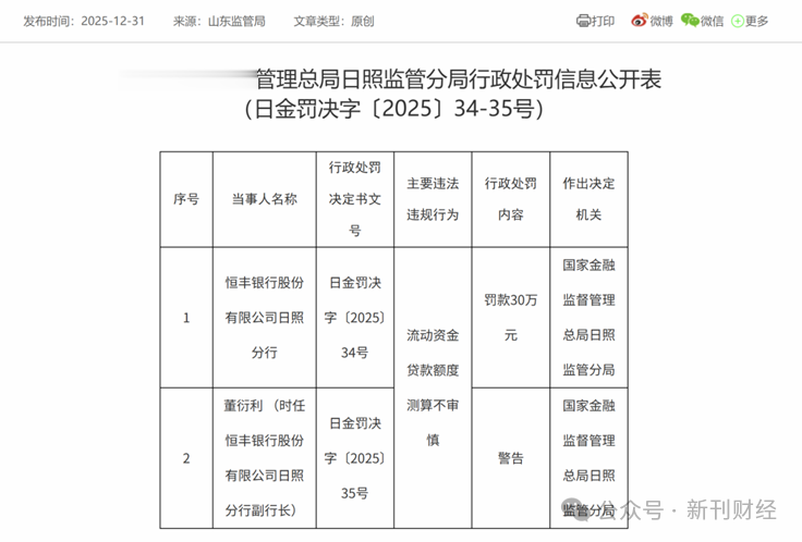 岁末年初,监管罚单密集落地,多家银行被“点名”。恒丰银行尤为“惹眼”——2025年12月末,恒丰银行滨州分行、日照分行、泉州分行接连领罚,违规领域集中于信贷全流程、数据报送等核心业务。