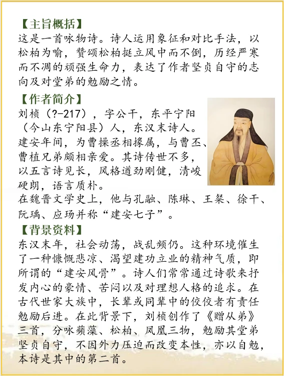 东汉末年,社会动荡,战乱频仍。这种环境催生了一种慷慨悲凉、渴望建功立业的精神气质,即所谓的“建安风骨”。诗人们常常通过诗歌来抒发内心的豪情、苦闷以及对理想人格的追求。在古代世家大族中,长辈或同辈中的佼佼者有责任勉励后进。在此背景下,刘桢创作了《赠从弟》三首,分咏蘋藻、松柏、凤凰三物,勉励其堂弟坚贞自守,不因外力压迫而改变本性,亦以自勉,本诗是其中的第二首。