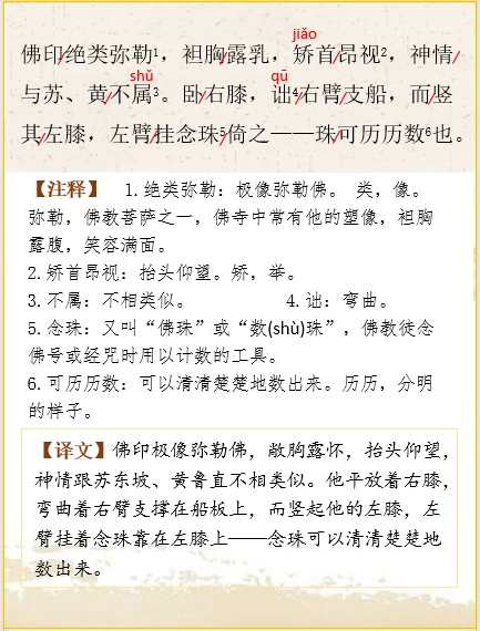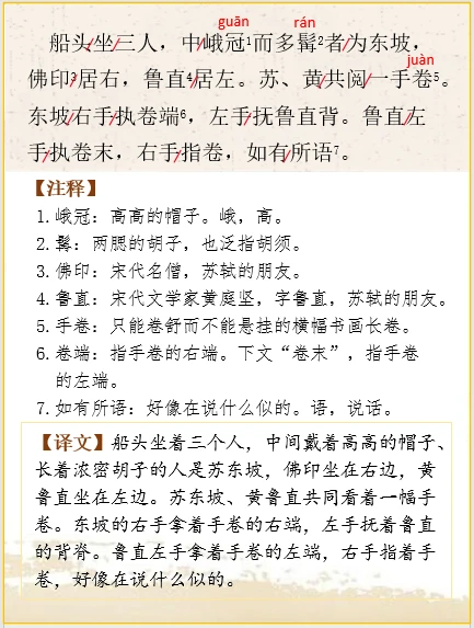 🌿船头坐着三个人,中间戴着高高的帽子、长着浓密胡子的人是苏东坡,佛印坐在右边,黄鲁直坐在左边。苏东坡、黄鲁直共同看着一幅手卷。东坡的右手拿着手卷的右端,左手抚着鲁直的背脊。鲁直左手拿着手卷的左端,右手指着手卷,好像在说什么似的。东坡露出右脚,鲁直露出左脚,各自略微侧着身子,他们的互相靠近的两膝,各自隐藏在手卷下边的衣褶里。佛印极像弥勒佛,敞胸露怀,抬头仰望,神情跟苏东坡、黄鲁直不相类似。他平放着右膝,弯曲着右臂支撑在船板上,而竖起他的左膝,左臂挂着念珠靠在左膝上——念珠可以清清楚楚地数出来。