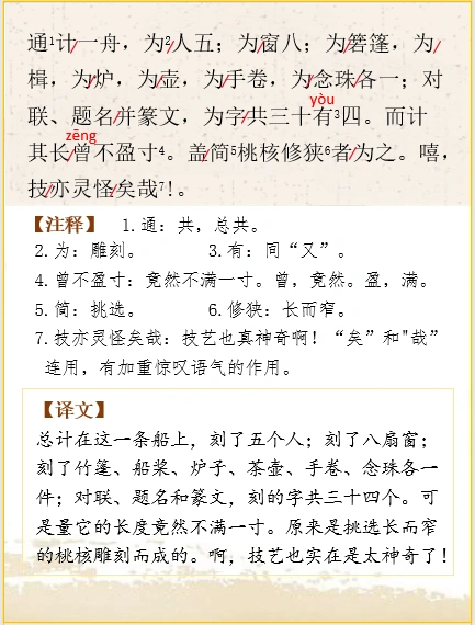 🌿总计在这一条船上,刻了五个人;刻了八扇窗;刻了竹篷、船桨、炉子、茶壶、手卷、念珠各一件;对联、题名和篆文,刻的字共三十四个。可是量它的长度竟然不满一寸。原来是挑选长而窄的桃核雕刻而成的。啊,技艺也实在是太神奇了!