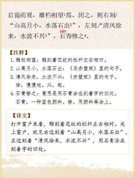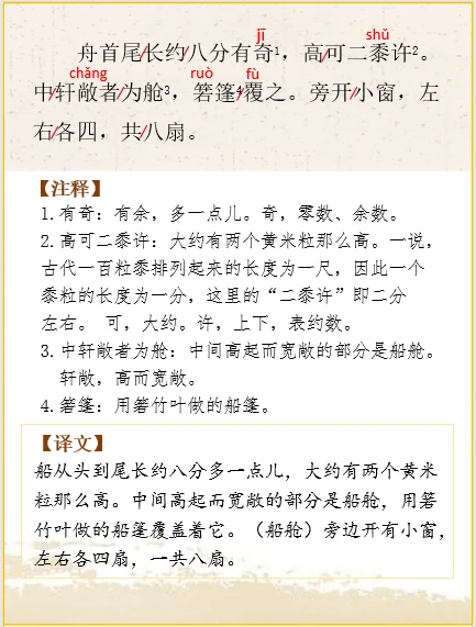🌿船从头到尾长约八分多一点儿,大约有两个黄米粒那么高。中间高起而宽敞的部分是船舱,用箬竹叶做的船篷覆盖着它。(船舱)旁边开有小窗,左右各四扇,一共八扇。打开窗户来看,雕刻着花纹的栏杆左右相对。关上窗户,就见右边刻着“山高月小,水落石出”,左边刻着“清风徐来,水波不兴”,用石青涂在刻着字的凹处。