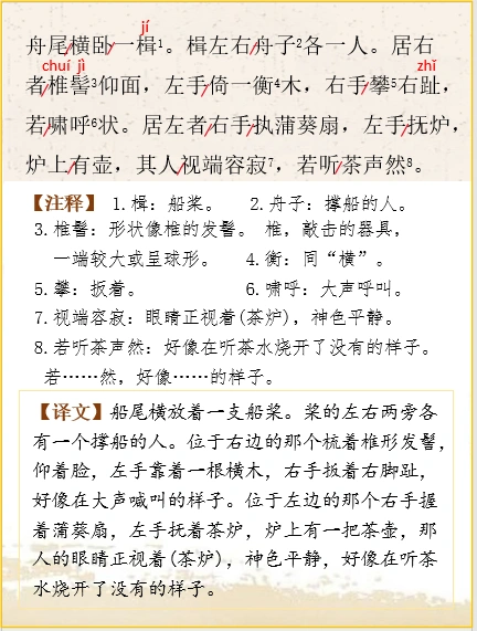 🌿船尾横放着一支船桨。桨的左右两旁各有一个撑船的人。位于右边的那个梳着椎形发髻,仰着脸,左手靠着一根横木,右手扳着右脚趾,好像在大声喊叫的样子。位于左边的那个右手握着蒲葵扇,左手抚着茶炉,炉上有一把茶壶,那人的眼睛正视着(茶炉),神色平静,好像在听茶水烧开了没有的样子。