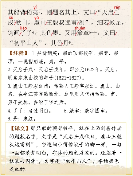 🌿那只船的顶部较平,就在上面刻着作者的题款名字,文字是“天启壬戌秋日,虞山王毅叔远甫刻”,字迹细小得像蚊子的脚一样,一勾一画都清楚明白,字体的颜色是黑的。还刻着一枚篆书图章 ,文字是“初平山人”,字的颜色是红的。