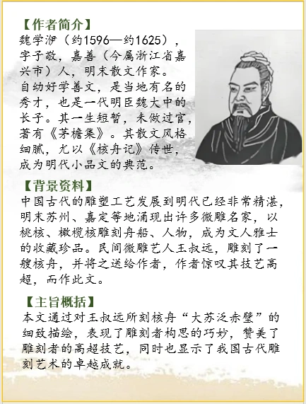 🌿明朝有个手艺奇妙精巧的人叫王叔远,(他)能够用直径一寸的木头,雕刻出宫殿、器具、人物,以及飞鸟、走兽、树木、石头,全都是就着(材料原来的)样子刻成(各种事物的)形象,各有各的神情和姿态。他曾经赠给我一只用桃核雕刻成的小船,(刻的)是苏轼游赤壁(的情景)。