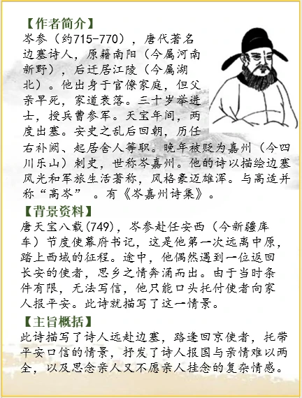 唐天宝八载(749),岑参赴任安西(今新疆库车)节度使幕府书记,这是他第一次远离中原,踏上西域的征程。途中,他偶然遇到一位返回长安的使者,思乡之情奔涌而出。由于当时条件有限,无法写信,他只能口头托付使者向家人报平安。此诗就描写了这一情景。