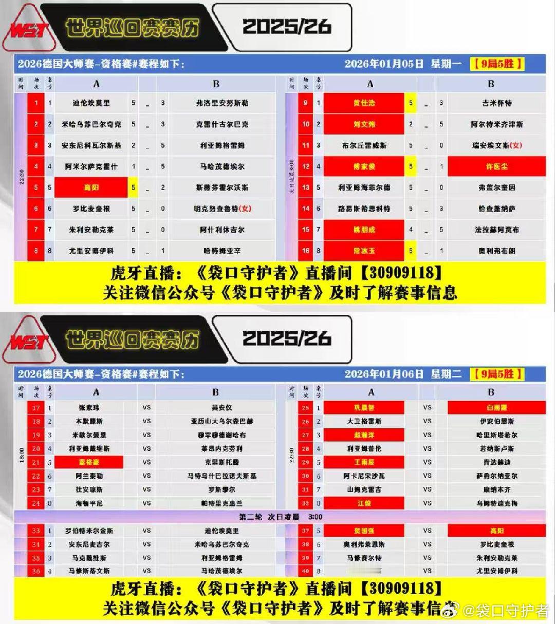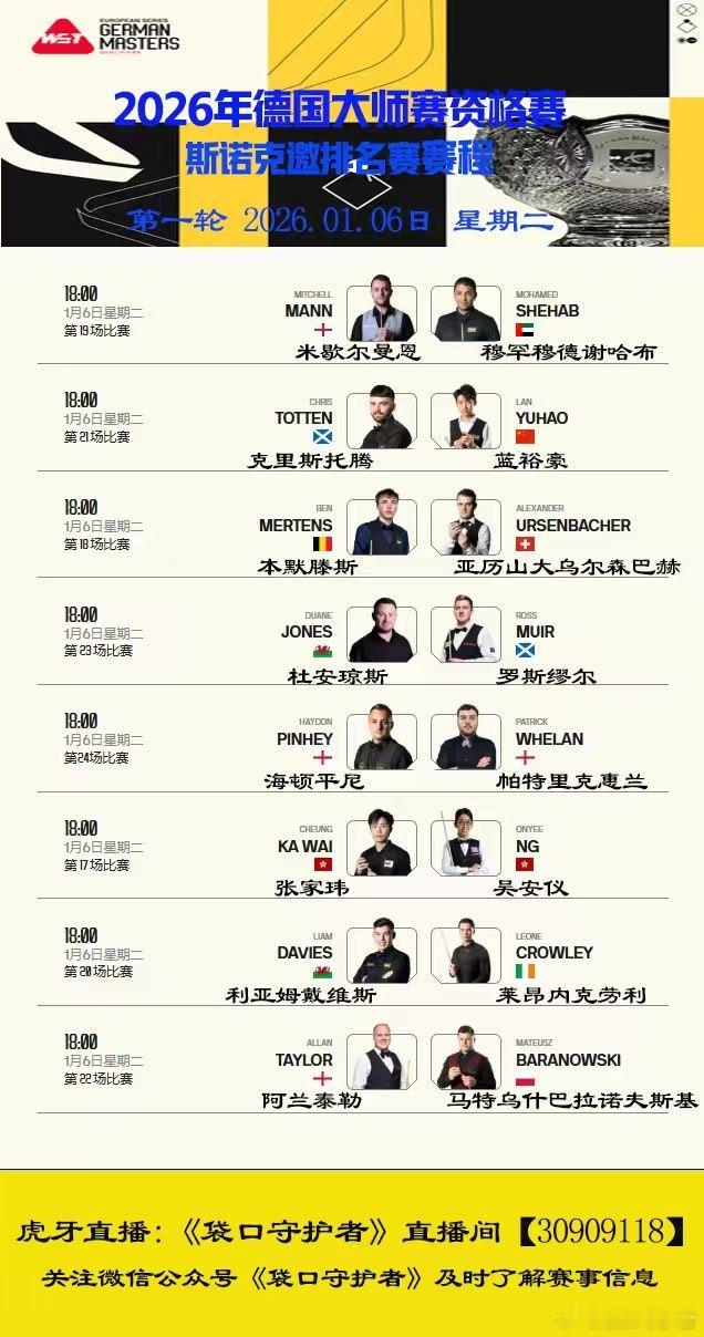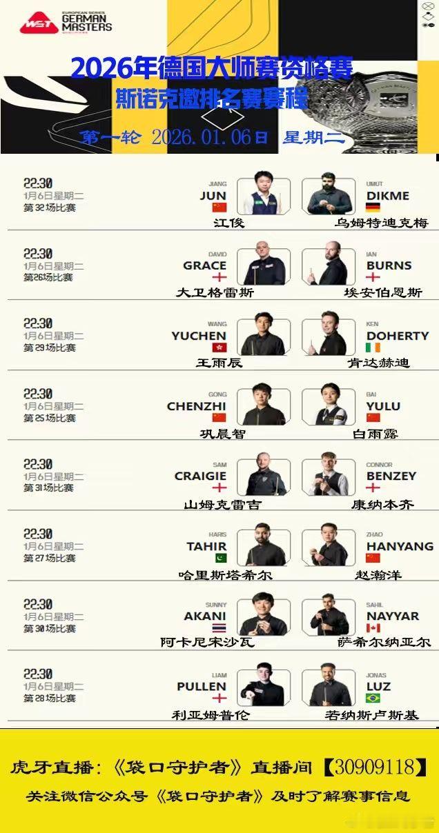 2026德国大师赛资格赛第二天中国选手高阳、傅家俊、常冰玉、黄佳浩等晋级962026.01.06日 星期二 9局5胜18:00 直播:蓝裕豪VS克里斯托腾22:30 直播:江俊VS迪克梅;白雨露VS巩晨智
