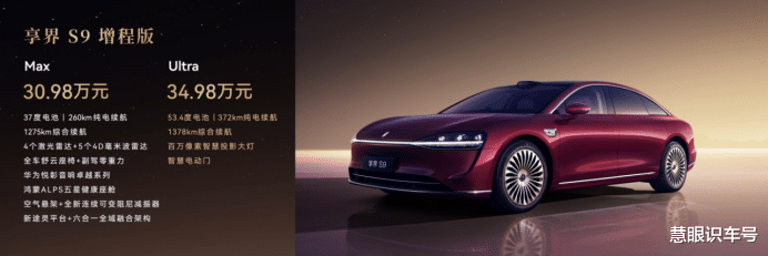 旗舰9系,越境豪华。新车共推出4个版本:享界S9增程版Max售价30.98万元,享界S9增程版Ultra售价34.98万元,享界S9纯电版Max售价32.98万元,享界S9纯电版Ultra售价36.98万元。首销期下定,可享受至高价值60000元权益[26],包括价值至高10000元寰宇红/浩宇蓝 外饰限时免费、价值10000元的零重力座椅抵扣券、价值20000元ADS高阶功能包补贴权益、价值6000元舒享用车大礼包、价值4000元辅助驾驶无忧服务权益、至高10000元的定向选配优惠。首销权益有效期至2025年12月22日 23:59:59,预订权益可叠加,更有至高15000元购置税补贴方案[27]。鸿蒙智行其他车型车主增购/换购新款享界S9享尾款减免20000元。目前,新款享界S9试驾车已陆续进入全国门店,用户可在全国800+线下阵地、鸿蒙智行官网、鸿蒙智行App、华为商城App、我的华为App等官方渠道预约体验试驾。
