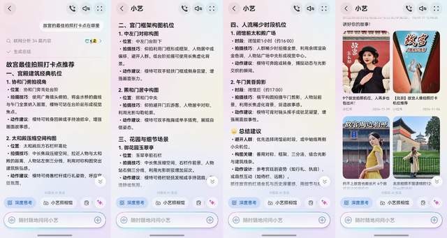 还有旅途中最重要的拍照环节,我也提前做好了功课。我直接问小艺:“故宫的最佳拍照打卡点在哪里”。小艺再次联动小红书的网友智慧以及实拍经验,告诉我:“协和门俯拍视角、太和殿压缩空间沟通、颐和门居中构图……”同样,有操作性非常高的故宫拍照打卡攻略笔记呈现。到时候,我跟着“抄作业”就好了。