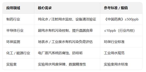 半导体行业超纯水 TOC 要求更严苛,通常≤10ppb,避免有机物导致晶圆表面缺陷。
