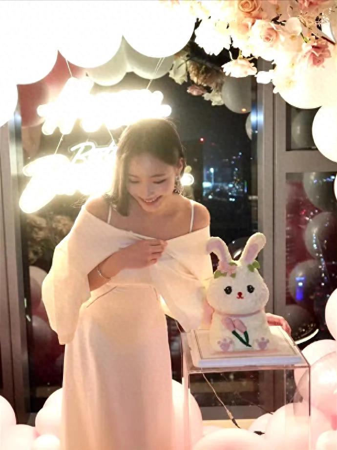 生日蛋糕也很可爱,是一个粉白兔子形状的蛋糕,生日现场也都是白色粉色系的很浪漫。
