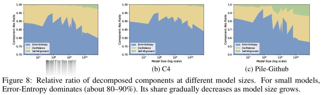 然而随着模型规模增大,误差熵占总损失的比例逐渐下降,而不遵循缩放规律的自对齐和置信度项占比相应上升。对于大模型来说,交叉熵中有越来越大的比例来自不缩放的成分。