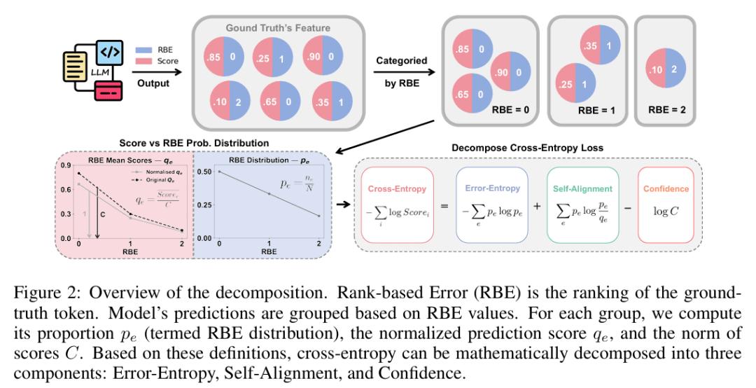 研究者为此提出了一个新指标:基于排名的误差(Rank-based Error, RBE)。与交叉熵关注正确 token 的概率得分不同,RBE 直接衡量正确 token 在模型输出中的排名位置。例如,如果有 4 个 token 的得分高于正确答案,那么 RBE 就等于 4。