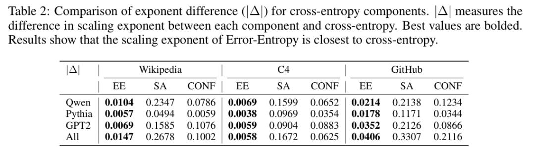 研究团队提出了一种全新的交叉熵分解方法,将其拆分为三个部分:误差熵(Error-Entropy)、自对齐(Self-Alignment)和置信度(Confidence)。通过在多个数据集上对 32 个模型进行系统实验,他们发现只有误差熵严格遵循幂律缩放,其余两项基本不随模型增大而变化。这一发现不仅为交叉熵规模定律失效提供了新的解释,也为大模型的训练和理论研究提供了一个更可靠的度量基准。