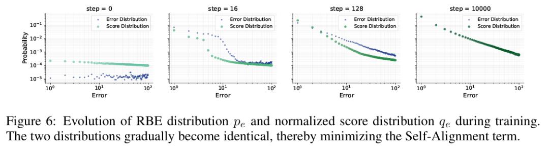进一步深入每个成分的细节:在训练初期,RBE 分布接近均匀,模型对哪个 token 正确几乎一无所知,排名近乎随机。随着训练推进,RBE 分布逐步向头部集中,正确 token 被越来越多地排到前列,误差熵因此持续下降。