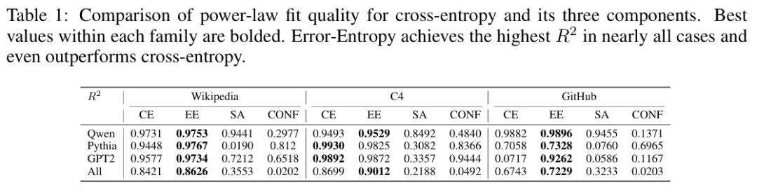 定量拟合的结果进一步验证了这一结论。论文使用标准幂律模型对各成分进行拟合后发现,误差熵的拟合优度在所有数据集上均显著高于交叉熵本身。这说明交叉熵之所以「看起来像」在缩放,本质上是因为误差熵在驱动整体趋势,而自对齐和置信度带来的噪声削弱了拟合精度。