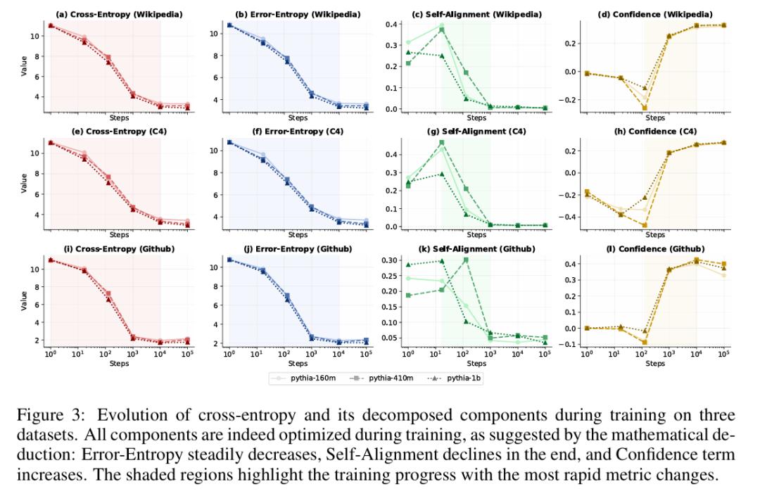 论文通过观察完整训练过程来验证分解的合理性。实验显示,三个成分在训练中呈现出清晰的优化顺序:模型在训练早期首先集中降低误差熵,在其下降一段时间之后才开始显著优化自对齐和置信度初始。