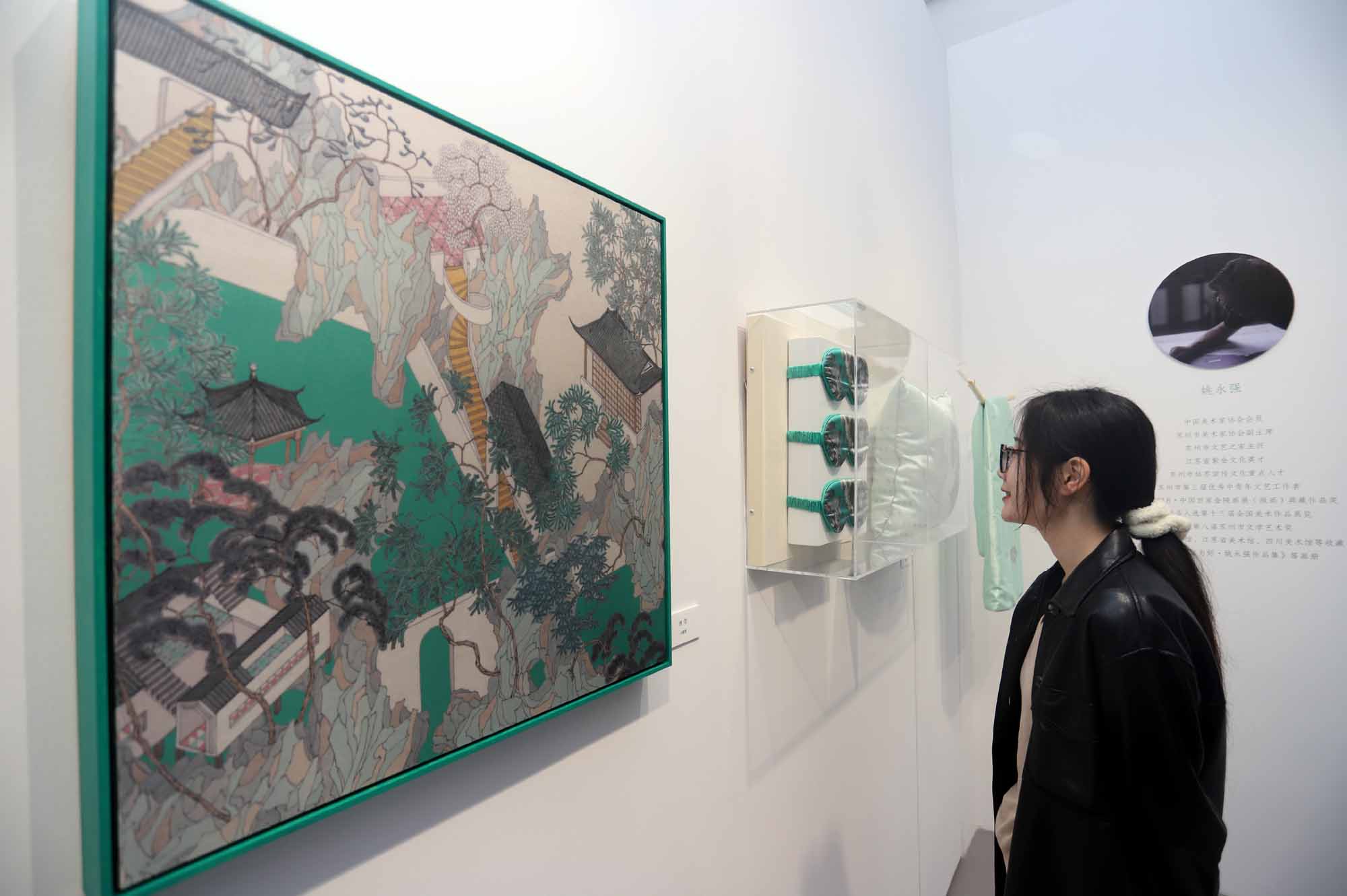 值得关注的是,画作创作与文创规划同步推进,成为此次展览的一大亮点。姚永强预先在画作中融入十余款几何纹样线稿,7月初作品扫描完成后,便邀请20余家文创供应商以及手工艺人集体读画,并将作品版权免费赠予苏州本地企业和工作室。    从7月到9月,经反复沟通打磨,40余款覆盖衣食住行的文创产品和艺术衍生品陆续成型,产品横跨缂丝、玉雕、陶瓷等传统非遗领域,也涵盖家纺、服装、丝绸制品及动画等现代工业及数字品类。期间,姚永强均全程提供艺术指导,确保产品既贴合“后园林”画作风格,又精准适配市场需求,实现艺术审美与生活实用的有机统一,同时打破了“艺术只存在于画框中”的局限。正如姚永强所言,艺术作品的生命力不该被禁锢,唯有走进大众生活,才能真正实现价值延伸,这次展览正是他对此理念的“大胆尝试与有趣探索”。    “他用了一种反向考古的方式,整合早年做吴地工艺美术研究积累的众多资源,使他绘画中虚构的现代产品在诸多设计师支持下从画中跳下来,画面中‘园林’的‘概念’局部、构建,变成一个个真实可感的手中之物。”苏州当代美术馆执行馆长王晓松说,这不是一个“画展”,而是从园林的视觉虚构到产品拆解、物化而进行信息传递的过程化展示。这场以巨作撑展、用文创落地的展览,不仅是姚永强个人艺术创新的集中呈现,更为传统园林的当代表达、艺术与生活的深度融合提供了极具价值的实践样本。