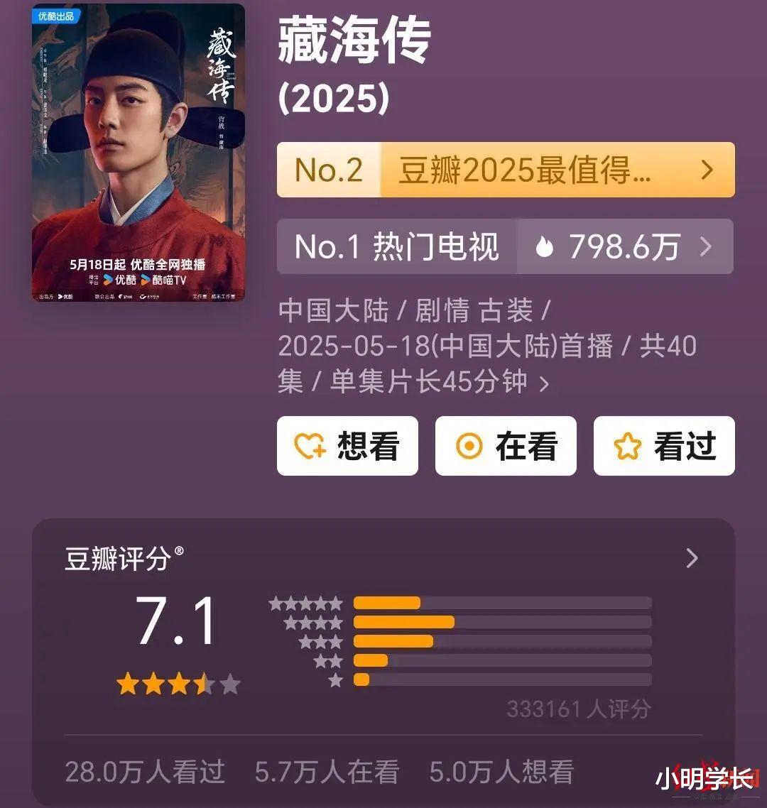 近日,由郑晓龙担任总导演,肖战等主演的古装剧《藏海传》在优酷迎来大结局,其豆瓣评分也终于浮出水面,7.1的分数在网上引发热议。