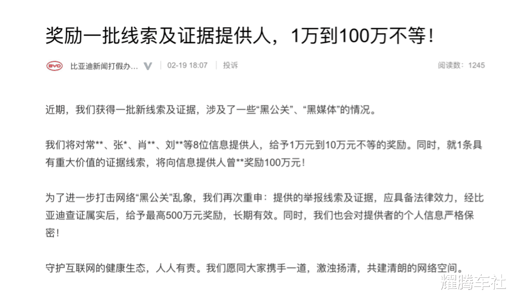 2月19日,比亚迪新闻打假办宣布,对8位“黑公关”相关信息提供人给予1-10万元不等的奖励,同时,针对1位具有重大价值的证据提供人奖励100万元!这表明了比亚迪坚决打击“黑公关”的决心,对黑公关现象零容忍!