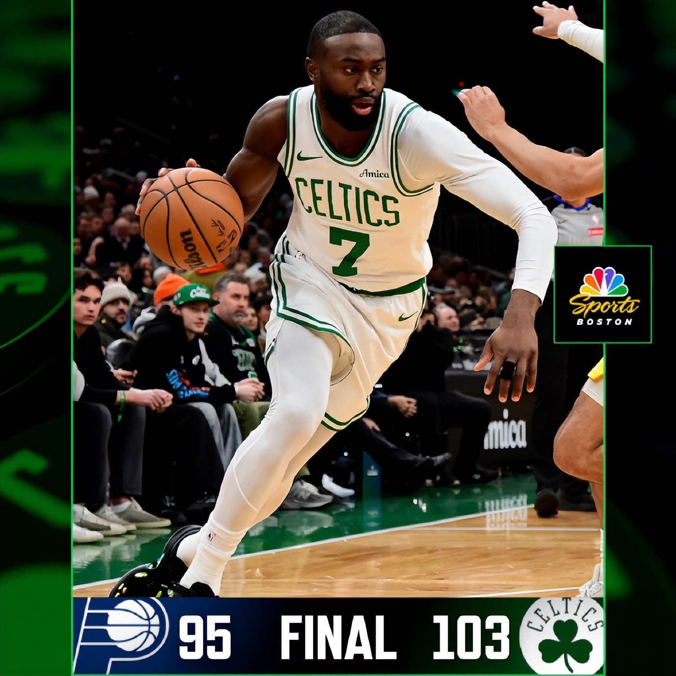杰伦·布朗表现依旧非常出色,出场33分钟,投篮25中11,三分球6中2,罚球8中7,拿到31分9篮板2助攻1抢断2盖帽的数据,末节独得14分带队逆转取胜。布朗已经连续7场比赛砍下30+,成为队史第三人,比肩伯德(连续9场)、皮尔斯(连续7场),而塔图姆也没做到过。