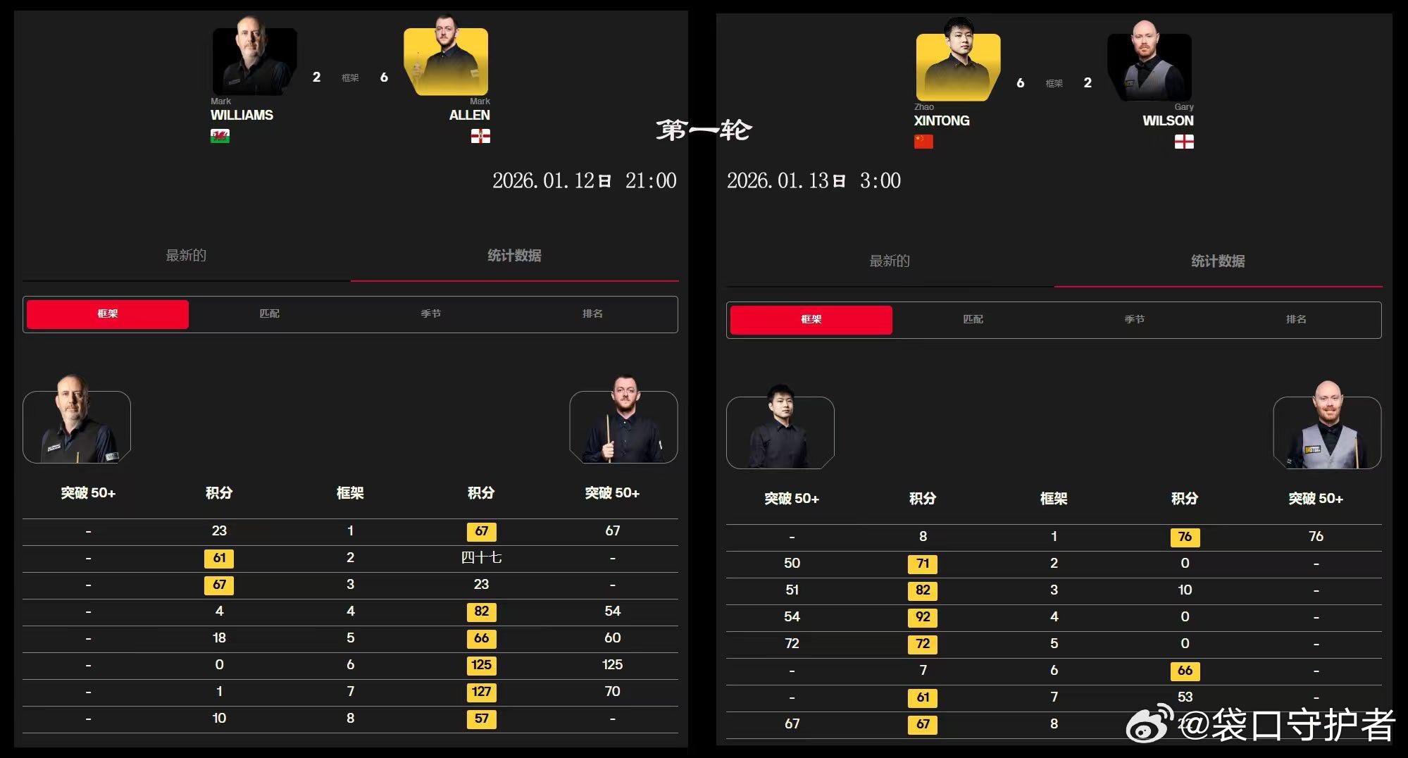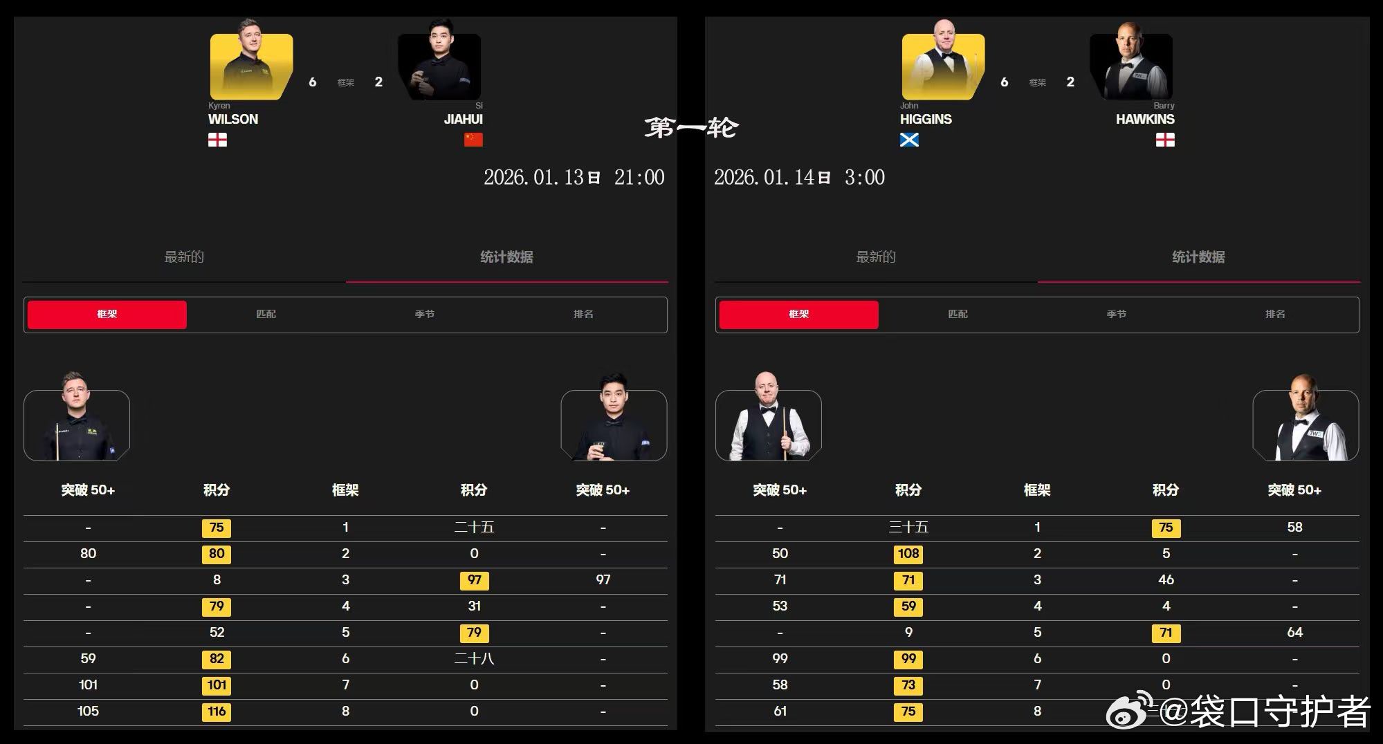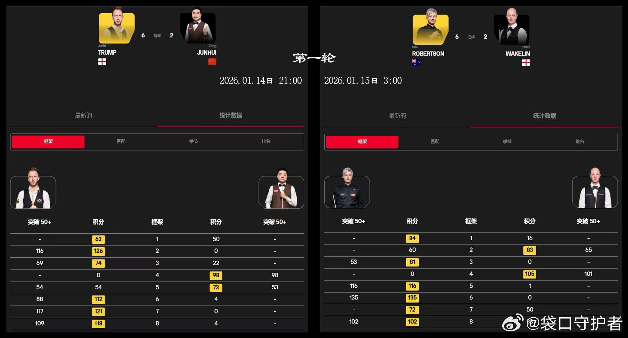 玄幻的比分——大师赛第一轮2026(约翰斯通)大师赛第一轮于2026.01.11日21开启至2026.01.15日凌晨结束。自吴宜泽大师赛首秀6:2战胜魔术师肖恩墨菲,到尼尔罗伯逊6:2拿下替补出战的克里斯韦克林(罗尼奥沙利文因病退赛,排名17的克里斯韦克林替补)连续出现8场8个6:2的历史性”奇迹”……
