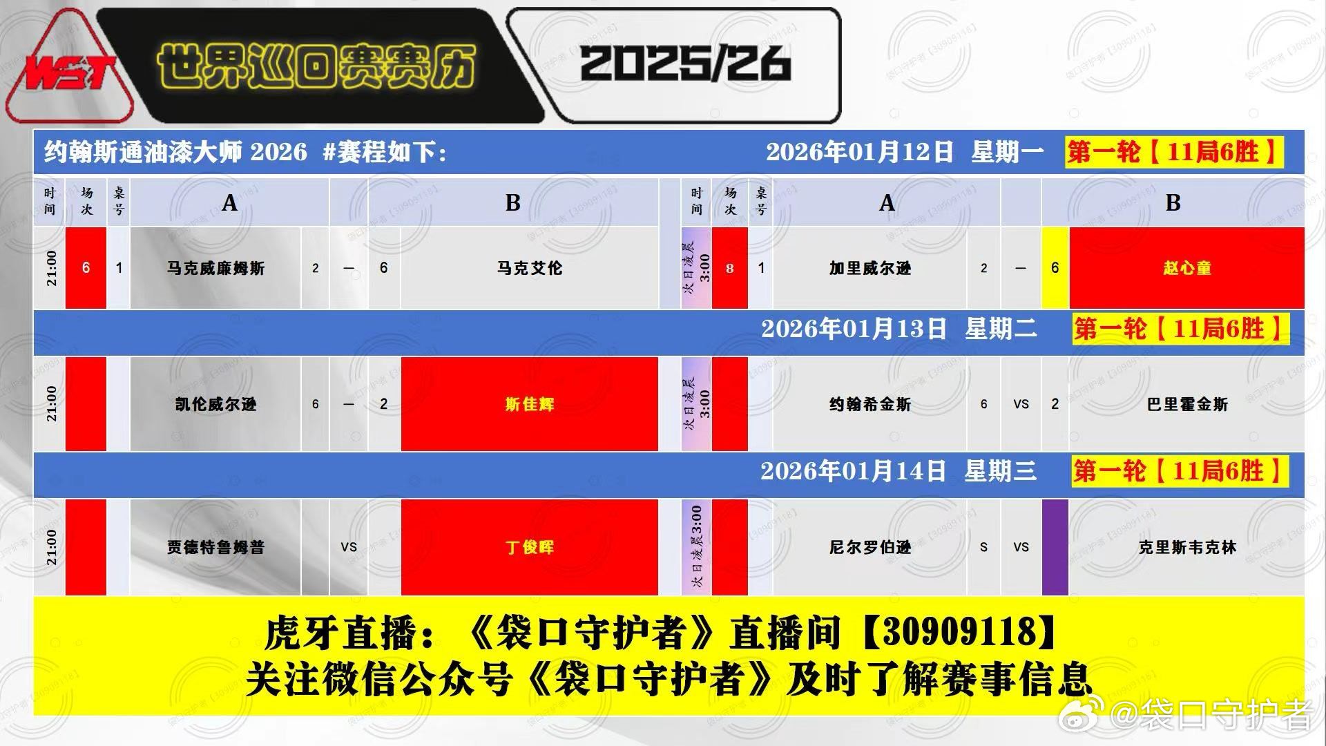 2026大师赛(三大赛)第四天 第一轮中国选手吴宜泽、肖国栋、赵心童晋级1/4决赛,斯佳辉止步16强2026.01.14日 星期三21:00 直播:贾德特鲁姆普VS丁俊晖