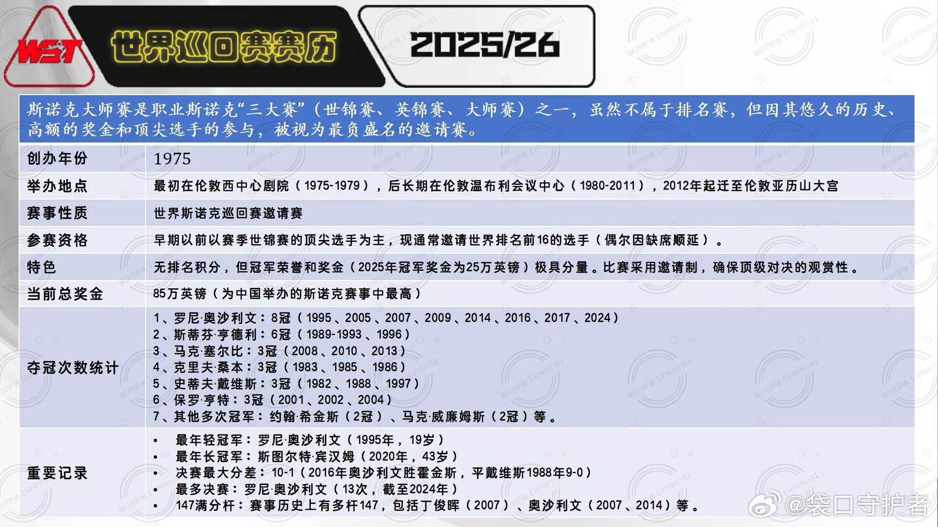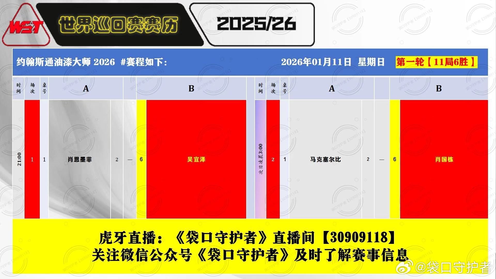 2026大师赛(三大赛)第二天中国选手吴宜泽、肖国栋晋级1/4决赛;2026.01.12日 星期一21:00 直播:马克威廉姆斯VS马克艾伦2026.01.13日 星期二3:00 直播:赵心童VS加里威尔逊