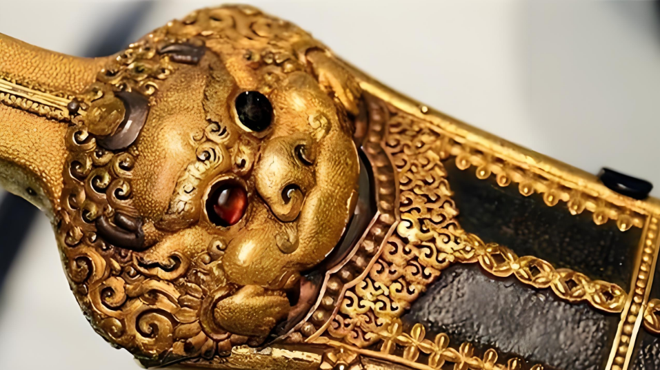 最令人惊叹的是它的装饰:剑格雕刻的佛教神兽“琼”,既符合西藏信仰,又展现中原工艺;木质剑鞘整体覆盖鎏金铜片,上面精细刻画着腾云驾雾的蟠龙;24K黄金镀层至今熠熠生辉。