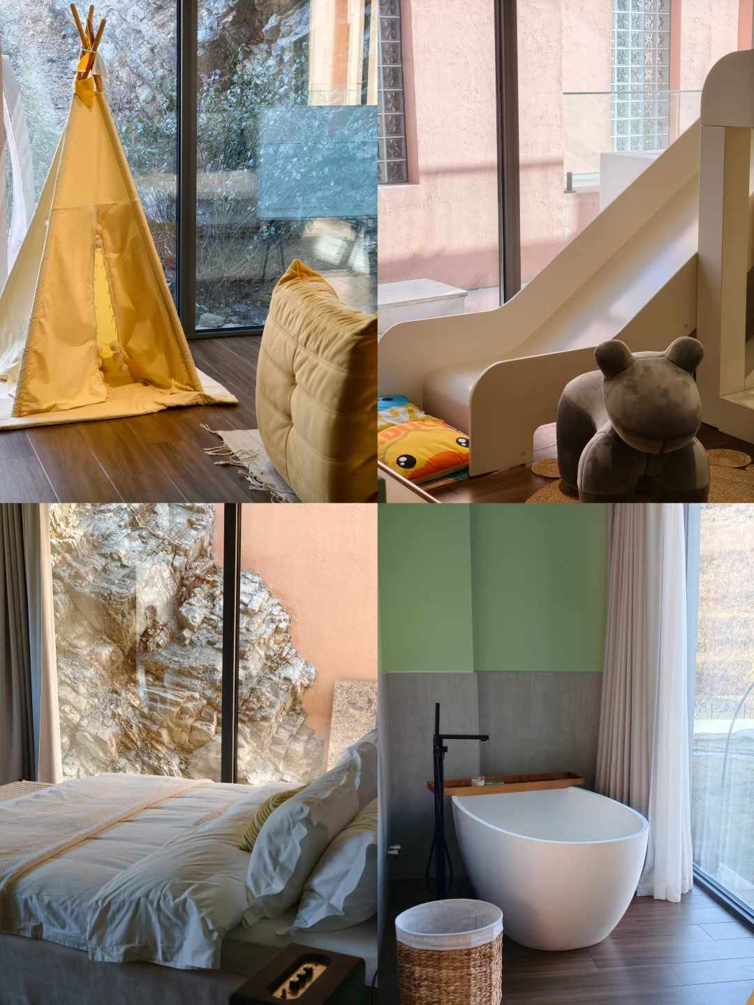 新年首个周末,一脚油门去天津蓟县,带娃去山里躺平 徒步、泡汤、唱K、看电影、浴缸泡澡,超豪华三餐两点吃得超满足,两天时光放松又chill,遛娃放空两不误,真心推荐 - 🏨住宿:天津坐忘山林温泉民宿 🐰家订的宝藏民宿,藏在村子尽头,环境静谧。民宿有三层,小山不高,爬几级台阶就有私密小空间供住客独处,视野广阔可在露台欣赏山林美景,享受远离城市喧嚣的松弛,体验真正的“坐忘”山林。我们住的亲子房超赞,落地窗暖阳入室,双床配暖灯温馨十足;滑梯更是娃的最爱,玩累直接躺滑梯下的床入睡,带娃力荐 房间设施品质高,宝格丽洗护、马歇尔音响、徕芬吹风机、智能马桶、voss矿泉水、minibar零食饮料满满当当,而且都很干净,住着很安心 - 🚗交通:北京出发1.5h,路况很好,民宿有停车场 - 🍲吃吃喝喝 超大亮点!人生第一次见餐食这么丰富的民宿,太幸福了 🔅早餐:火腿炒蛋煎饼玉米粥各种小菜,每人一大盘好丰富 🔅午餐简餐:自制炸酱面🍜、两大盘饺子🥟吃得饱饱的 🔅下午茶:茶水水果坚果一大盘送到屋里,午觉睡醒就有点心吃 🔅晚餐:真的惊到我了,10个菜2主食,超豪华晚餐‼️一大桌菜,海鲜、水库鱼、虾球都巨好吃,厨师是原万豪行政酒廊主厨,摆盘和味道都超预期 🔅夜宵:有夜宵‼️炖出胶的银耳羹,还有一杯老板特调酒🍷,周末之夜一口升华 🔅走的时候,还送了一大包山楂糕!好吃😋大人孩子都爱吃 - ⭐特色体验 🚶徒步:下午上山逛了逛,整个山头都是老板的,山顶观景台、无边泳池、茶室、阳光房值得一去 ♨洞穴温泉:民宿隔壁就是温泉,水放好了,是公汤但没有人,我们一家三口包场!傍晚泡汤别有一番体验,从白天泡到晚上 🎤唱K:自带影音室,曲库全音质好,怒唱2小时包场 🏍野骑越野车:联系山里的俱乐部体验山地摩托车,丛林越野超酷超刺激,这次没来得及,下次一定 - 真的词穷,也是真的好,不愧是天津唯1️⃣四星民宿 听老板说装修花了1400w,真的品质高 - 早上睡到自然醒,睁眼是山与自然,心情瞬间被治愈,开启元气满满的一天 窝在房间里也有幸福感,泡个热水澡、看电影、喝点小酒,享受独属自己的松弛时刻 这次民宿体验真的绝了,已经开始期待过年带着全家再来天津感受这份独属的新年温暖