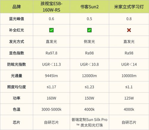 二、核心数据对比为直观呈现书客Sun2、米家立式学习灯、孩视宝E5B-160W-RS的性能差异,我们整理了三款产品的核心护眼参数,涵盖蓝光控制、红光增益、防眩光、光通量等关键维度。这些参数直接决定护眼效果与场景适配性,帮助快速定位产品优势,为选购提供一定的参考。