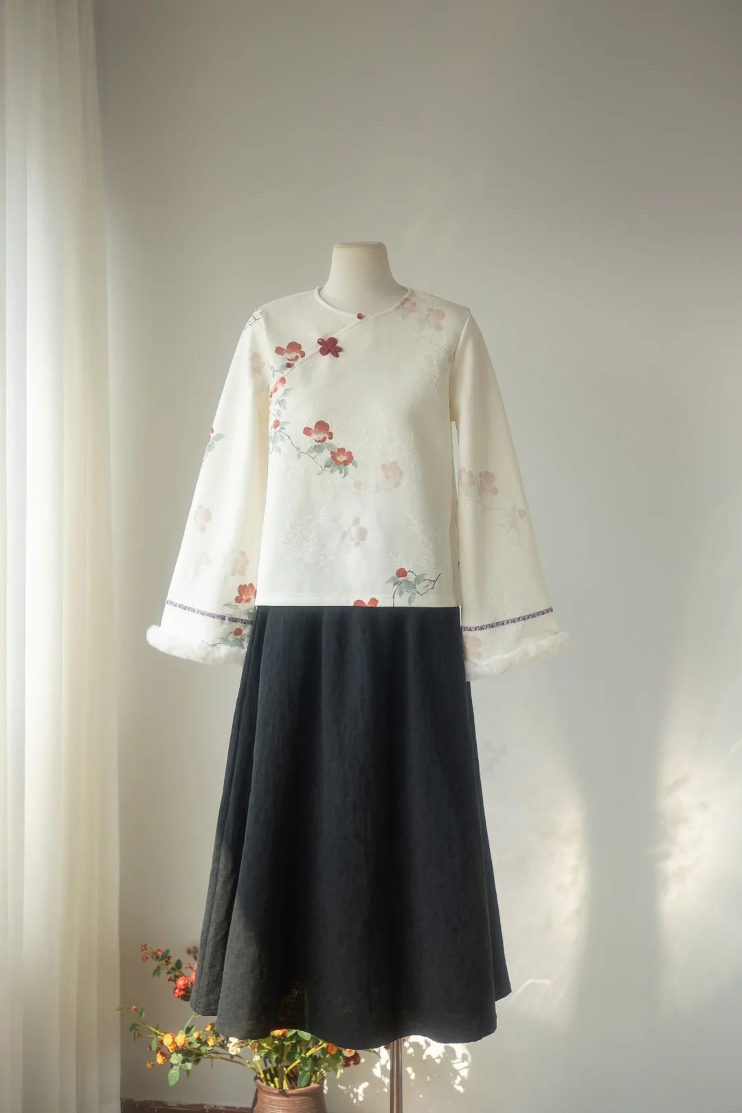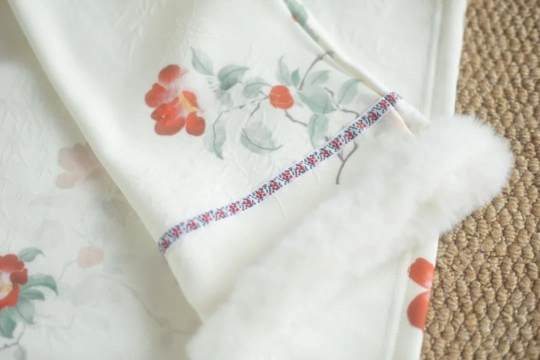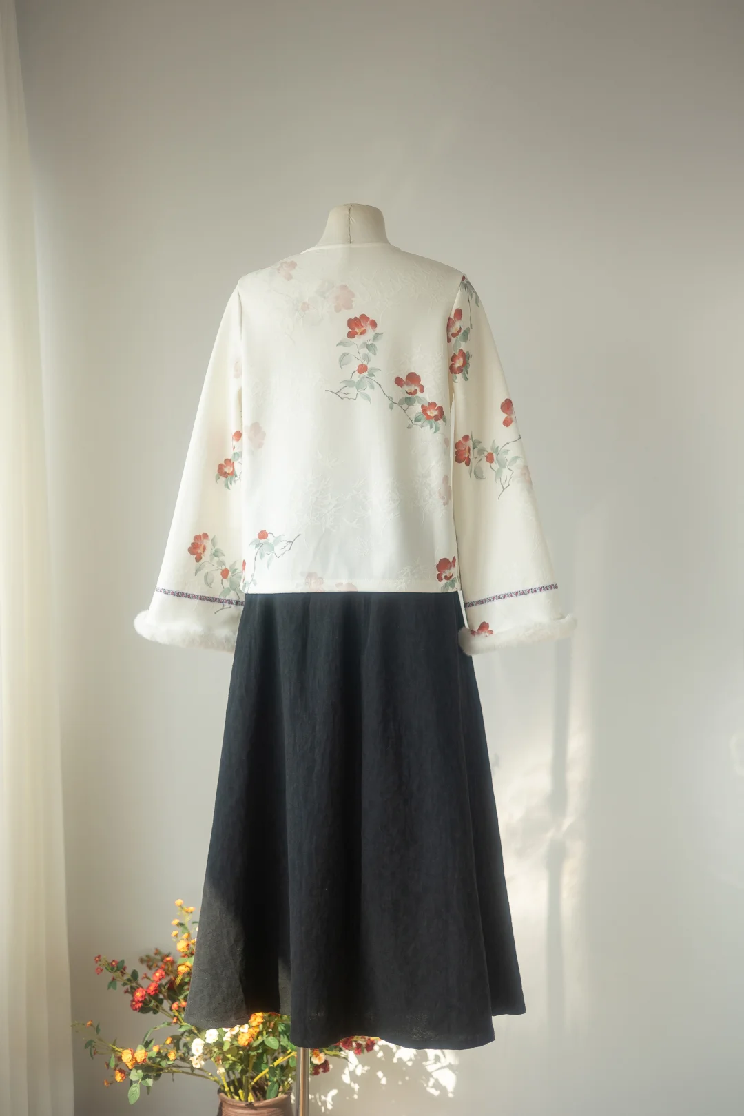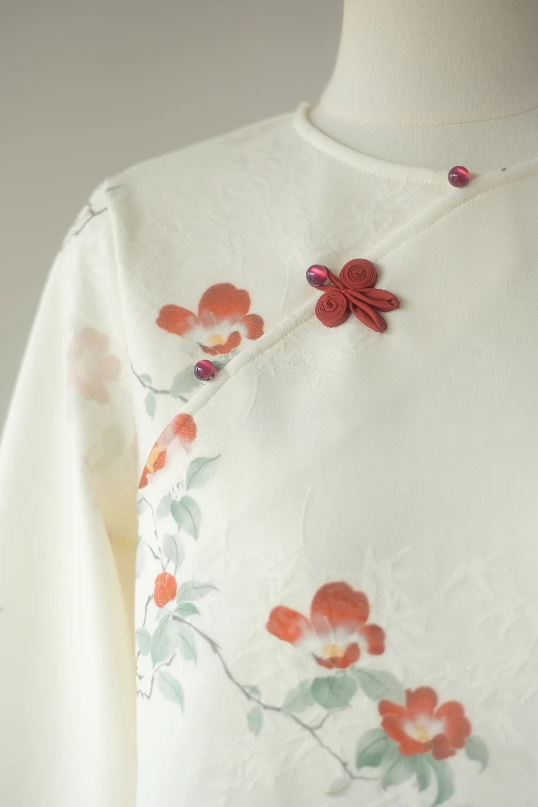 手绘的海棠花印花,是那种淡淡的水彩感,不会像普通印花那样生硬,走动起来真的自带柔光滤镜