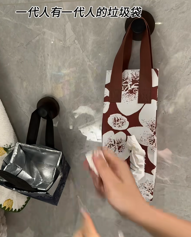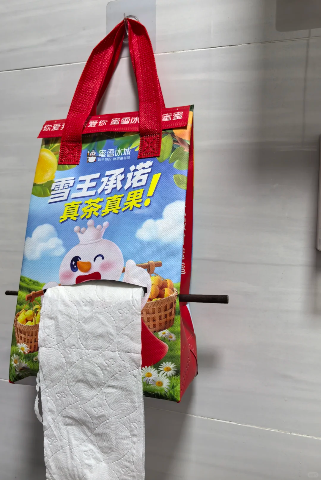 外卖袋子、奶茶袋子都有吧!找个大小合适的,直接放在卫生间收纳纸巾就行了,不用剪不用者,直接挂在卫生间就可以,脏了直接扔掉,主要就是防水还不花钱。