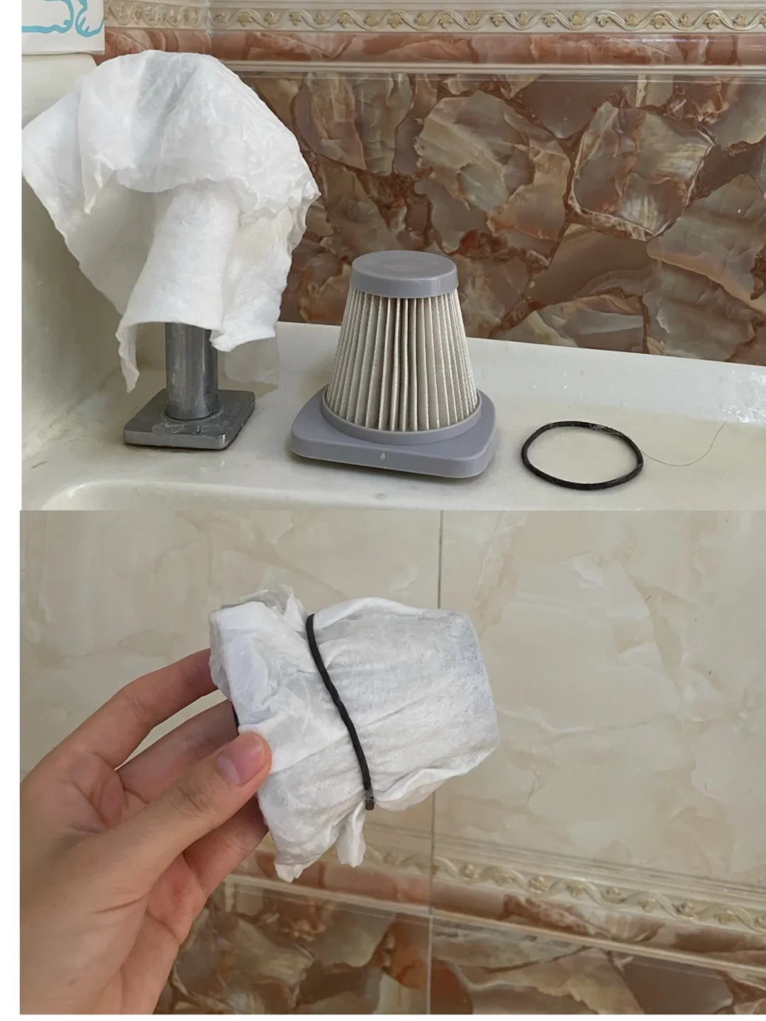 比如家里的吸尘器,我们可以拿出一个皮筋儿,把二次洗脸巾套在吸尘器滤网上,这样每次只要更换洗脸巾就可以了,