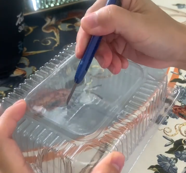 方法特别简单:是需要将透明水果盒清洗干净,擦干水分之后在盖子中间划出一个长方形的小口。