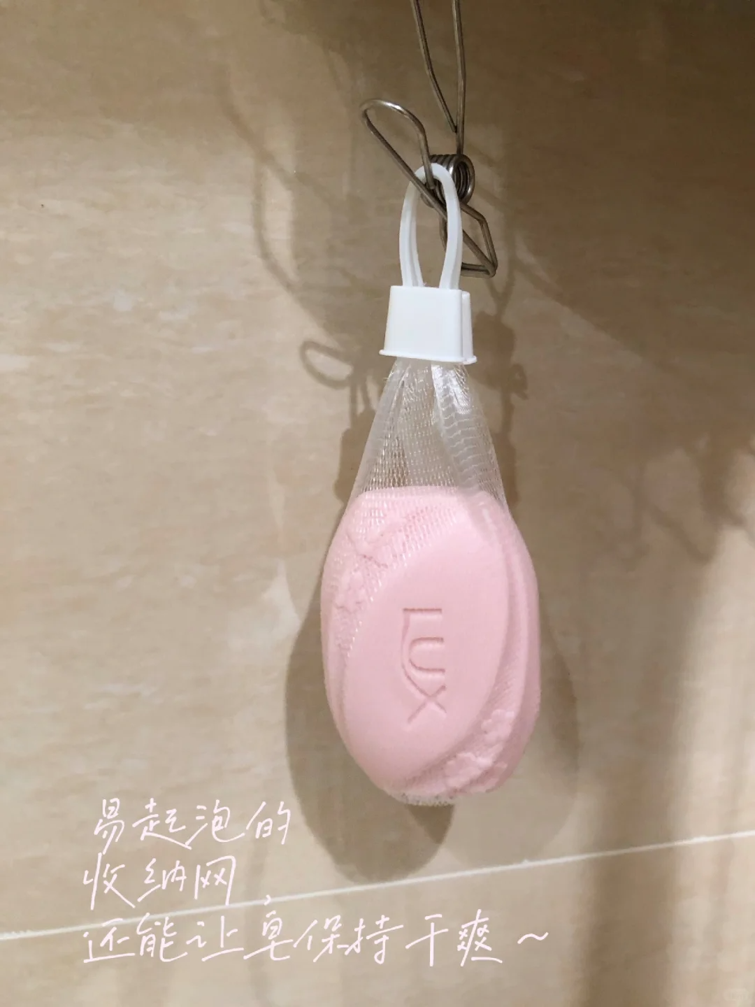 封口的绳子一抽直接挂在旋转挂钩上就行,适用于多个肥皂的收纳。不占地方,起泡丰富,肥皂用小了可以直接放块新的就可以继续用,也不浪费。
